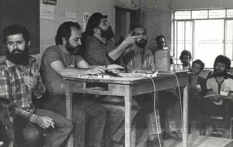 Evento não identificado com a participação de Lula [Reunião?] (Local desconhecido, 1983). / Crédito: Autoria desconhecida