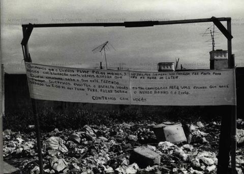 [Faixa convocando moradores de bairro para reunião discutir sobre saneamento básico e a questão do lixão?] (Local desconhecido, data desconhecida). / Crédito: Autoria desconhecida.