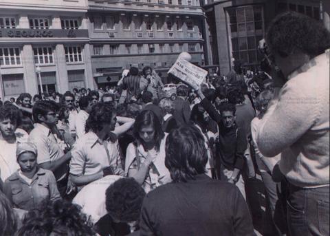 Homem com jornal Em Tempo na mão em manifestação não identificada (Local desconhecido, Data desconhecida). / Crédito: Autoria desconhecida.