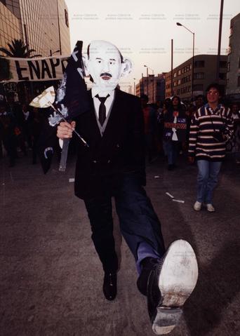 Manifestante com máscara imitando o ex-presidente Carlos Salinas de Gortari (México, fev. 1995). / Crédito: Jorge Nunez/Abril Press.