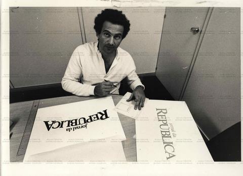Pessoa não identificada desenha logomarca do Jornal da República (Local desconhecido, Data desconhecida). / Crédito: Hélio Campos Mello.