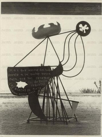 Registro de escultura exposta no vão do Masp, Museu de Artes de São Paulo, com inscrição de poema de Federico Garcia Lorca (São Paulo-SP, Data desconhecida). / Crédito: Niels Andreas.