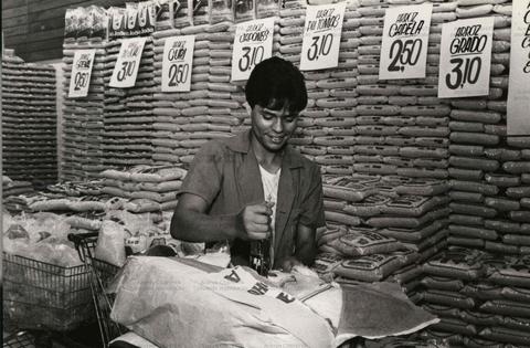 Retrato de trabalhadores marcando preços em alimentos no supermercado (Local desconhecido, Data desconhecida). / Crédito: Roberto Parizotti